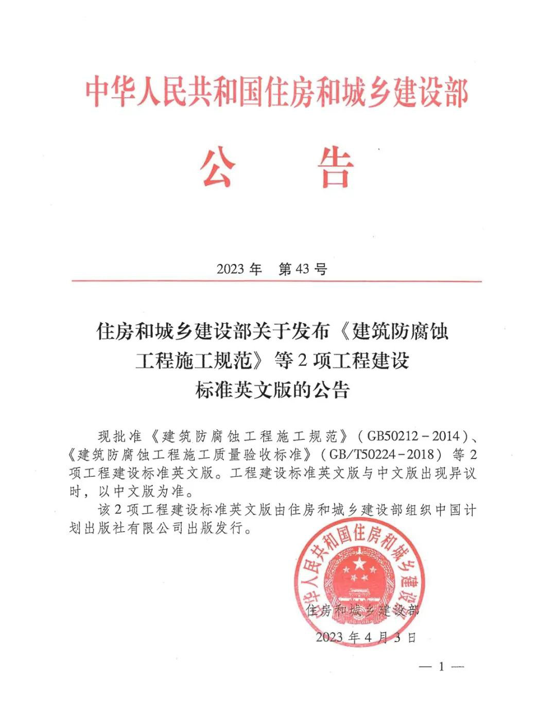 中華人民共和國住房和城鄉建設部發布2023年第43號公告:批準《建筑防腐蝕工程施工規范》(GB50212-2014)、《建筑防腐蝕工程施工質量驗收標準》(GB/T50224-2018)等2項工程建設標準英文版,并由中國計劃出版社有限公司出版發行。