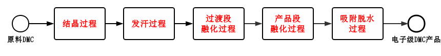 為了進一步提升DMC產品的含量,得到更高品質的DMC產品,本項目采用熔融結晶技術,利用DMC凝固點(4℃)高于甲、乙醇高的特點,選擇適宜的溫度使CH3OH-DMC共沸液凝固結晶,打破了共沸液組成,然后通過緩慢熔融后得到99.99%的高純碳酸二甲酯,最后通過吸附脫水裝置,去除產品中的甲醇、乙醇等雜質,生產高品質電子級DMC產品。