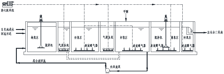 好氧池內布置兩段式氣提系統,混合液回流比可達到20以上,進而實現池內水流的能動調節,使得生化池內濃度梯度最小化,提高了耐沖擊負荷的能力,而能耗遠低于傳統回流工藝。