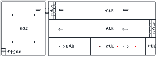 生化池沿水流方向分為:缺氧區-氣提區-好氧區-氣提區-好氧區-兼氧區-好氧區,兼氧區除布置了攪拌器外,還布置了曝氣系統,可實現缺氧區與好氧區的切換運行。從而保證生化池可以以A/O和兩級A/O兩種模式運行,提高了對水質波動的應對能力的同時也節約了藥劑消耗。