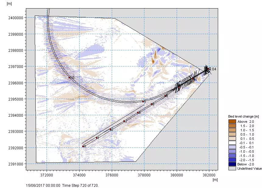 天津設計院項目團隊,從2017年開始對項目沙波沙脊區管道敷設開展攻關研究,通過長時間的詳細勘察測量及水文觀測,獲得了詳盡的海床地形、地質和水文數據。在此基礎上,運用三維海床可視化建模及大型有限元數值分析,清晰判別了路由走廊內的沙波形狀、運移趨勢,預測了運營期內管道路由走廊內的海床沖淤變化,精確設計了管道敷設預處理范圍及埋設深度,為保障管道安全打下了堅實基礎。