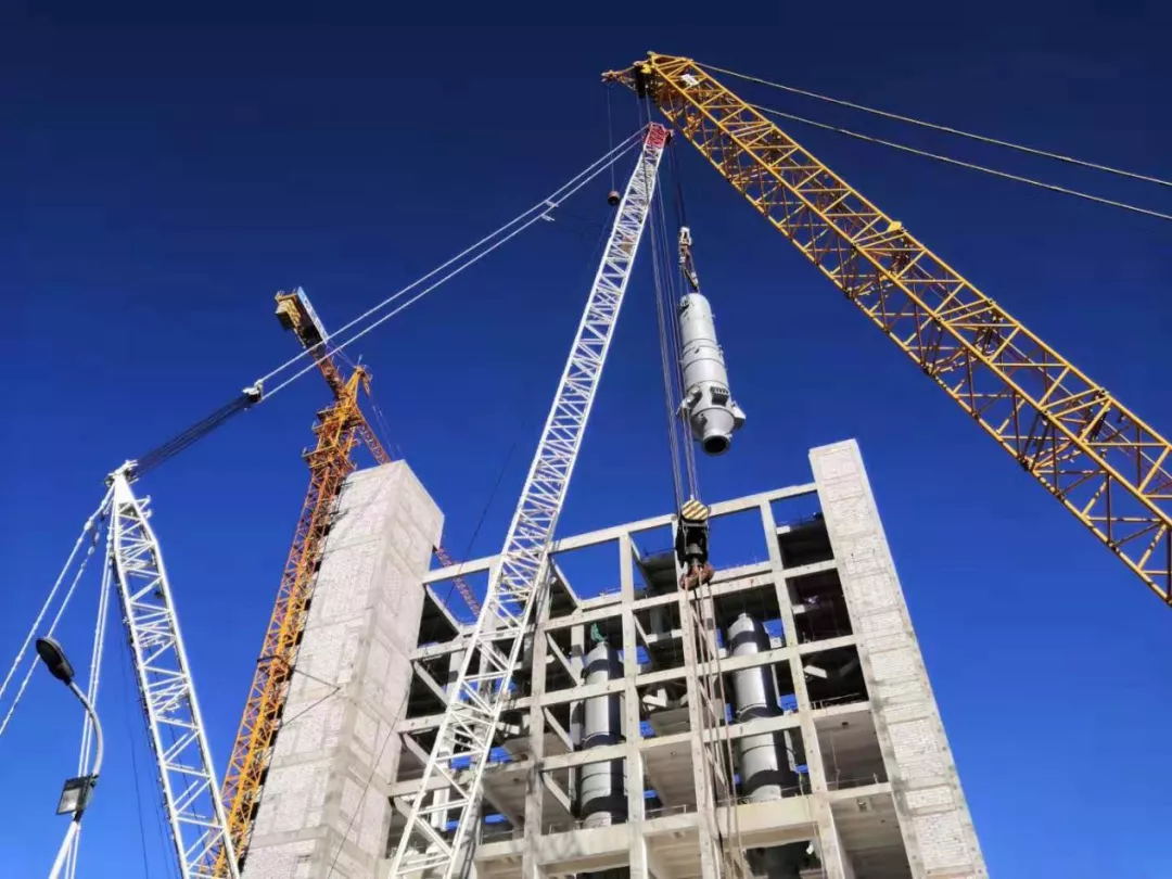 氣化爐最大直徑3.3米,高度22.238米,實際吊裝重量310噸,吊裝高度52米,自上而下落座至28.5米氣化框架基礎,此次吊裝由1250噸履帶吊車和450噸履帶吊車一次吊裝完成。