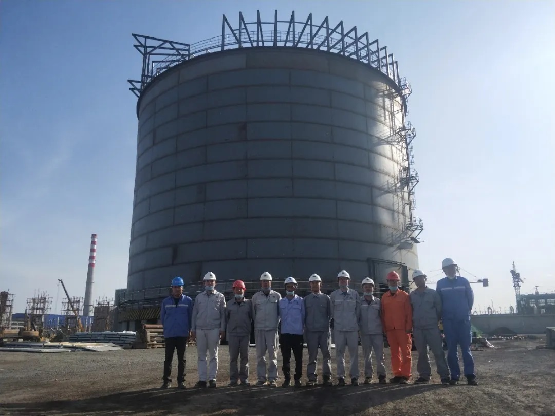 自2020年1月份安裝工作開始后,項目經歷了大雪天氣、疫情等因素的考驗,東華科技山西美錦華盛乙二醇項目部精心組織、科學安排,細化每一道施工流程,對每一道工序進行跟蹤檢測、復檢、抽檢,實行質量控制“三檢制”。蒸發器容器壁板、罐頂安裝克服了高空作業、壁板交叉以及罐體新老銜接等技術難題,確保了LNG儲罐的焊接質量,探傷一次合格率98.39%,并按照計劃節點順利完成安裝工作。