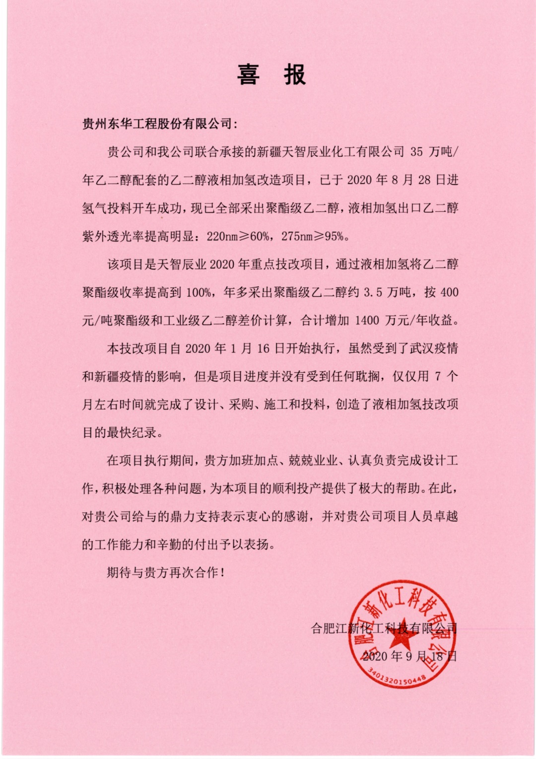 近日,業主方合肥江新化工科技有限公司特此發來喜報,感謝貴州東華項目組人員的辛勤付出,對項目組人員的工作能力予以了高度肯定。