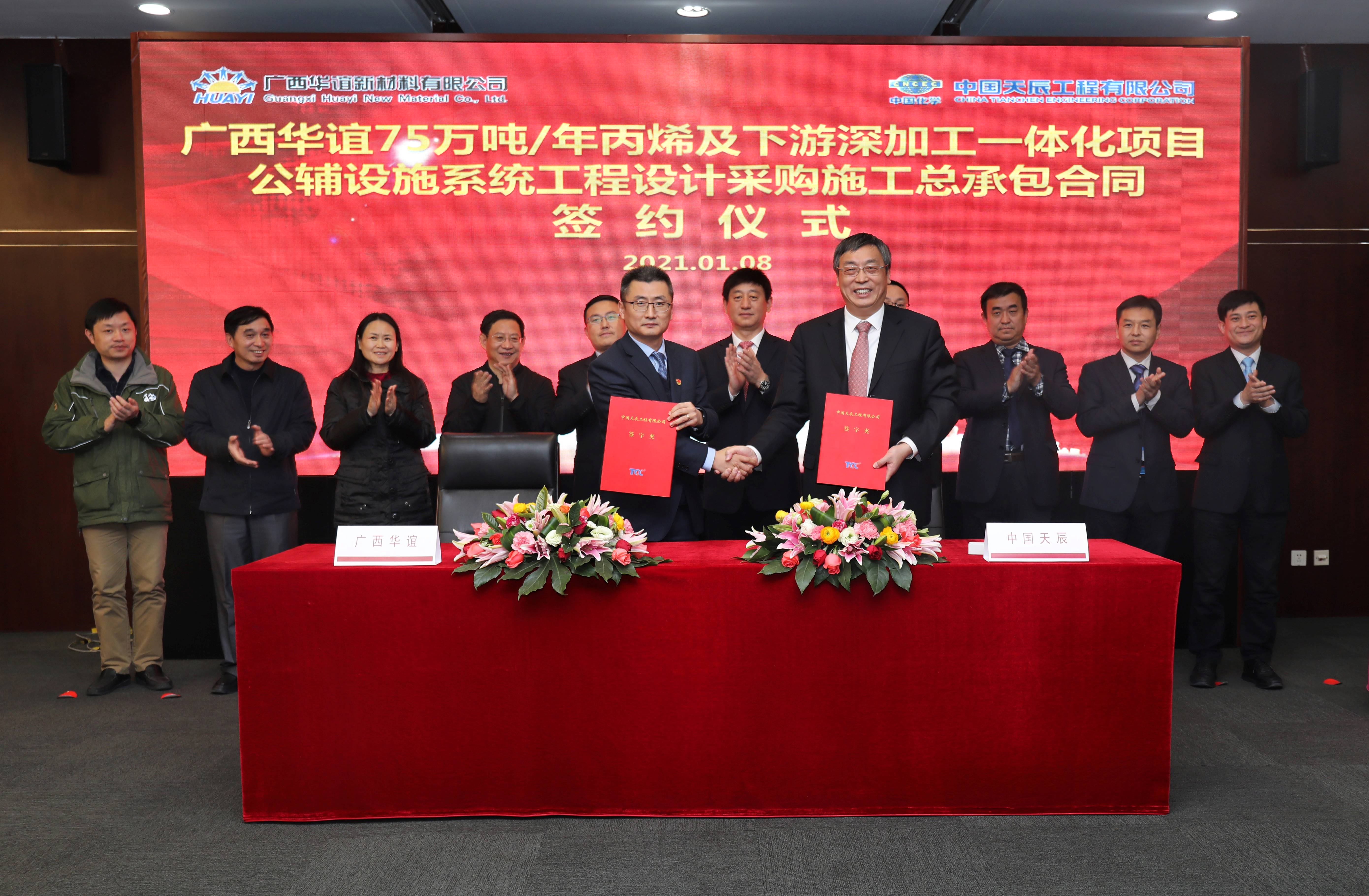 1月8日,中國化學中國天辰工程有限公司與廣西華誼新材料有限公司在天津舉行廣西華誼75萬噸/年丙烯及下游深加工一體化項目公輔設施系統工程設計采購施工總承包合同簽約儀式。