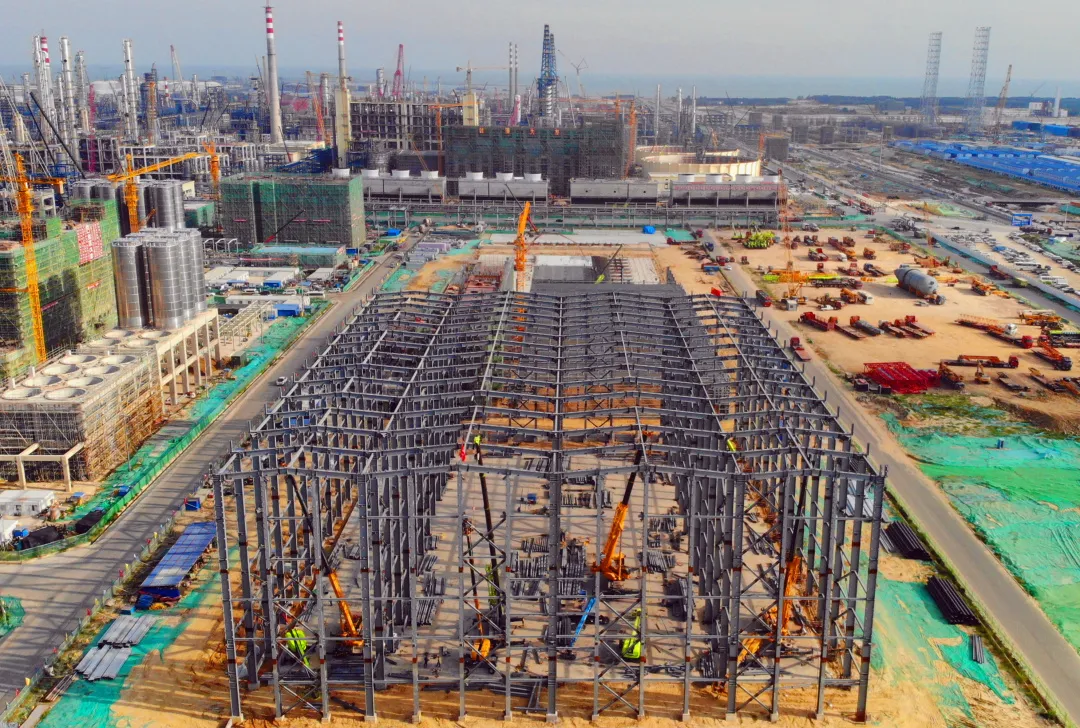 面對工作任務重、人員勞動強度大、臺風、暴雨天氣頻繁、高空作業面廣及防高處墜落風險突出等困難,聚烯烴庫房分項目部緊密圍繞施工總體節點計劃,每日通報施工任務以及當天施工完成情況,管理團隊緊盯現場,對施工作業面進行風險隱患排查,積極推動施工進度,加強施工質量控制,全力保證項目如期完成。