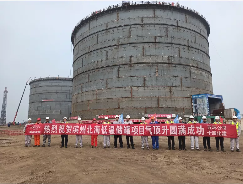 10月31日上午,中國五環工程有限公司濱州臨港化工產業園首站項目第一臺8萬方丁烷儲罐成功氣壓升頂。