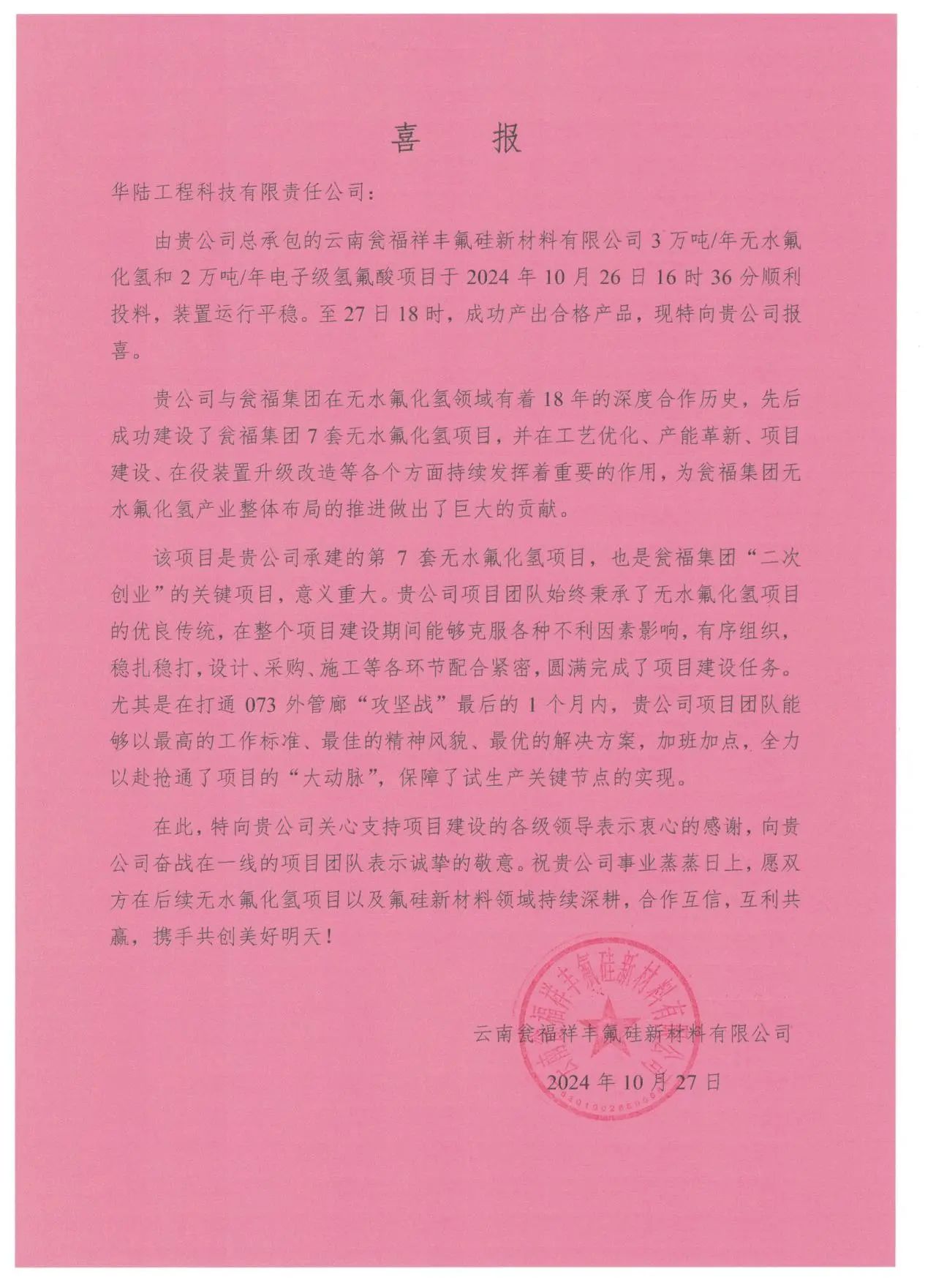 近日,由中國化學華陸工程科技有限責任公司EPC總承包的云南甕福祥豐氟硅新材料有限公司3萬噸/年無水氟化氫和2萬噸/年電子級氫氟酸項目順利投料并成功產出合格產品。此番試車成功,標志著公司在氟硅新材料領域的突破性進展。該項目是公司與甕福集團合作的第七個無水氟化氫項目,建成后將實現磷礦伴生氟資源的社會效益、環保效益、經濟效益“三豐收”。