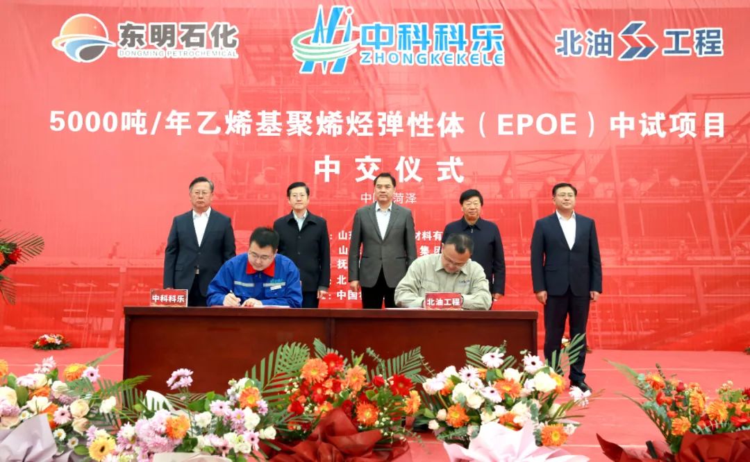 項目現場舉行了隆重的中交儀式,菏澤市委常委、秘書長、統戰部部長周生宏,東明縣委縣政府相關領導,合肥中科科樂新材料有限責任公司創始人陳昶樂教授,東明石化集團黨委書記、董事局主席李湘平,北京石油化工工程有限公司董事長許緘濤,中國機械工業機械工程有限公司總經理王宏博出席儀式并致辭。北油工程項目負責人與合肥中科科樂簽訂工程中交證書。